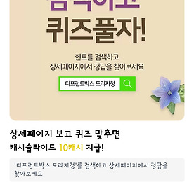 디프런트 박스 도라지천 DIFFERENT BOX 검색해서 퀴즈를 풀어보자! 정답은?? 디프런트 박스 도라지청 DIFFERENT BOX 검색해서 퀴즈 풀자!힌트를 검색해서 상세 페이지에서 정답을 찾으세요.디프론트박스 도라지청 상세페이지보고 퀴즈맞추면 캐시슬라이드 10캐시 지급!디프런트 박스 도라지청을 검색하여 상세페이지에서 정답을 찾으세요.